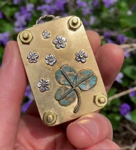Functional micro flower press locket, hand fabricated in golden jeweler's brass and featuring sterling silver forget-me-not flowers and a verdigris clover leaf.